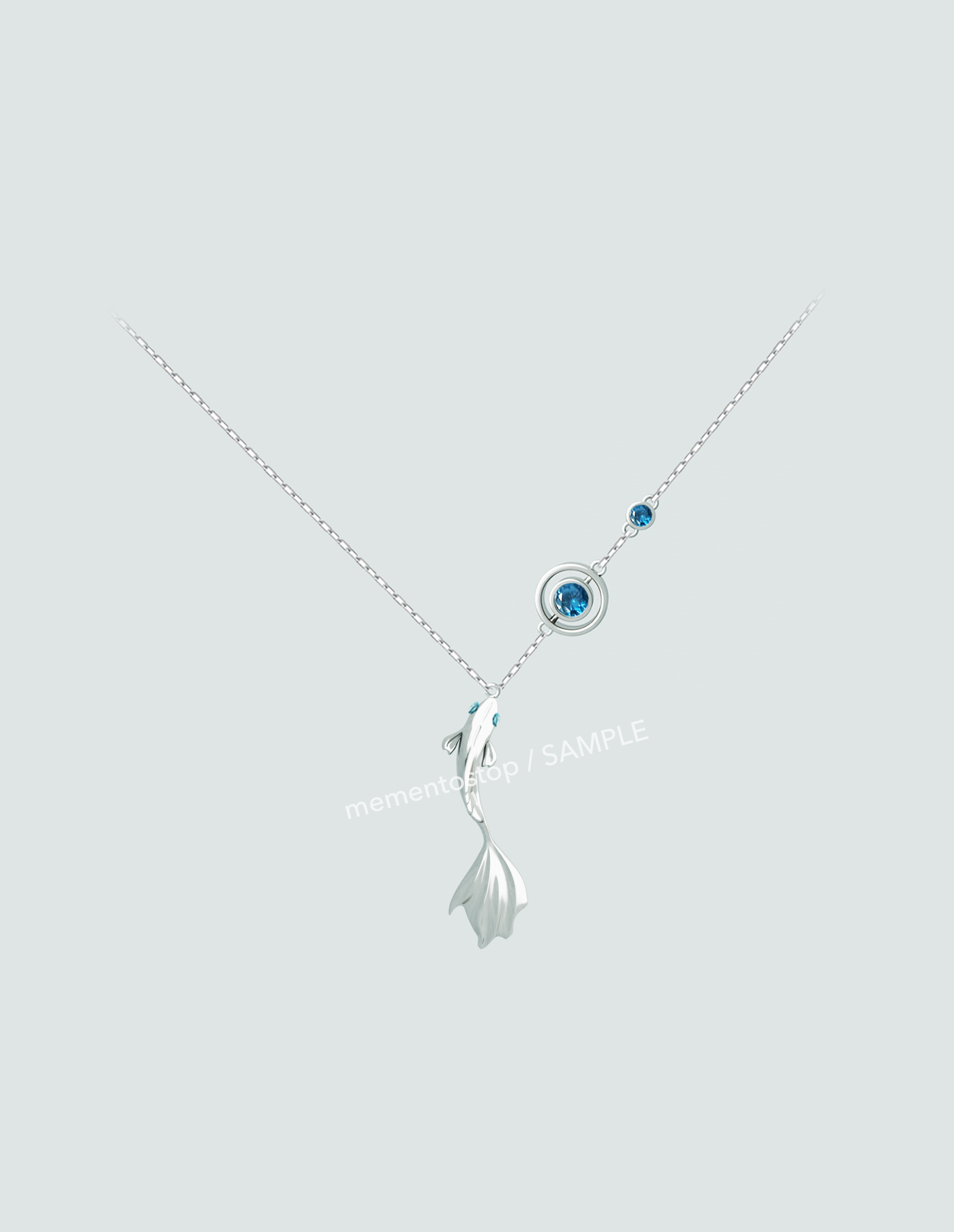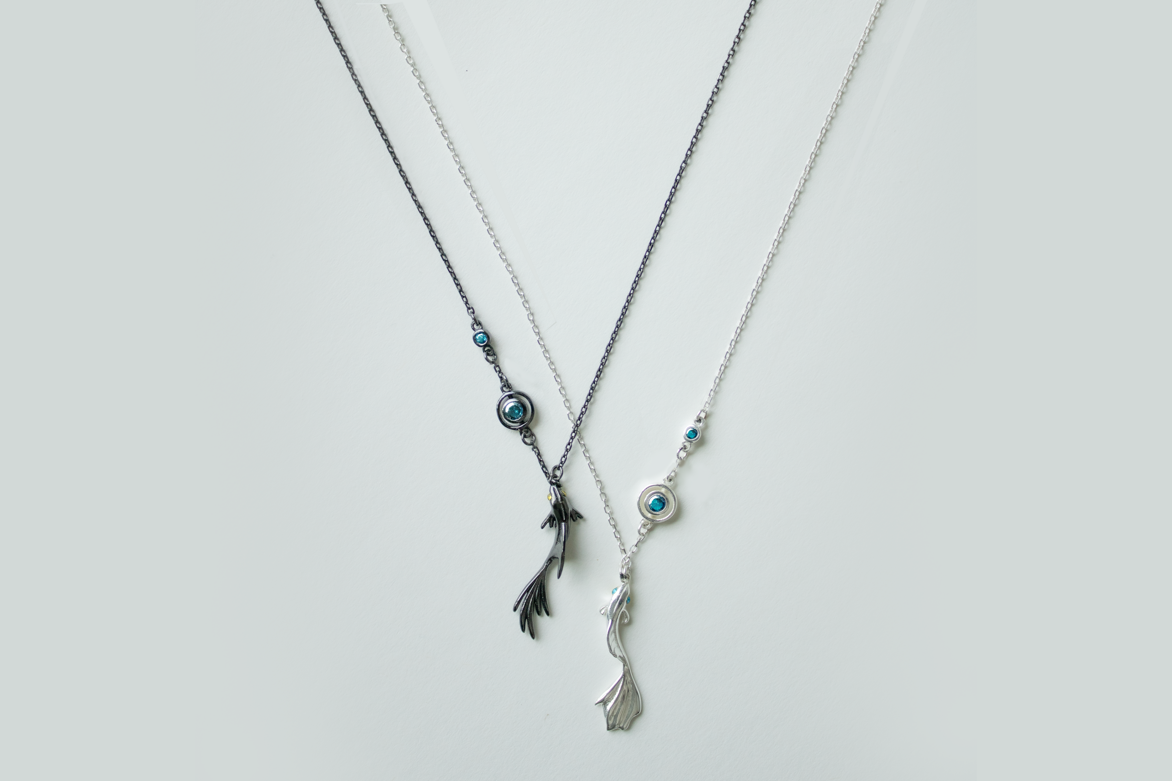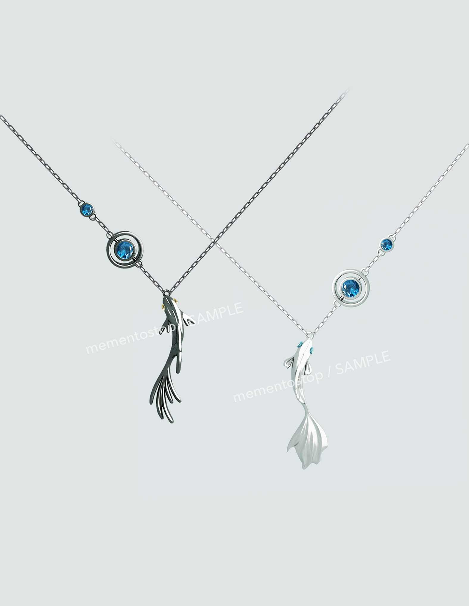 Capture the feeling of seishun, or 青春 (blue spring), with our matching necklace set, featuring black and white beta fishes. Delicately crafted sterling silver pendants bring the fish to life, while blue cubic zirconia stones symbolize water puddles, adding a touch of brilliance.